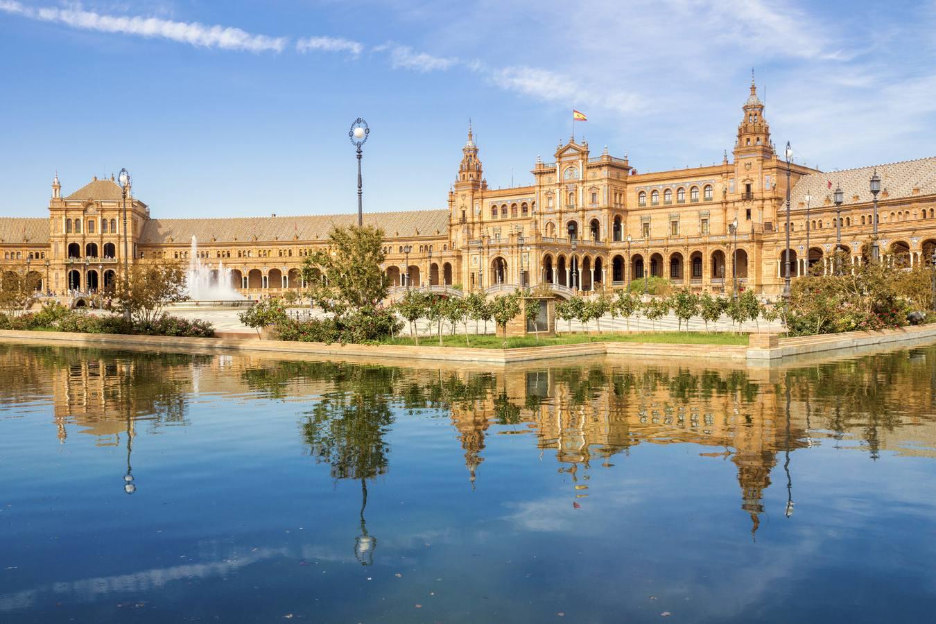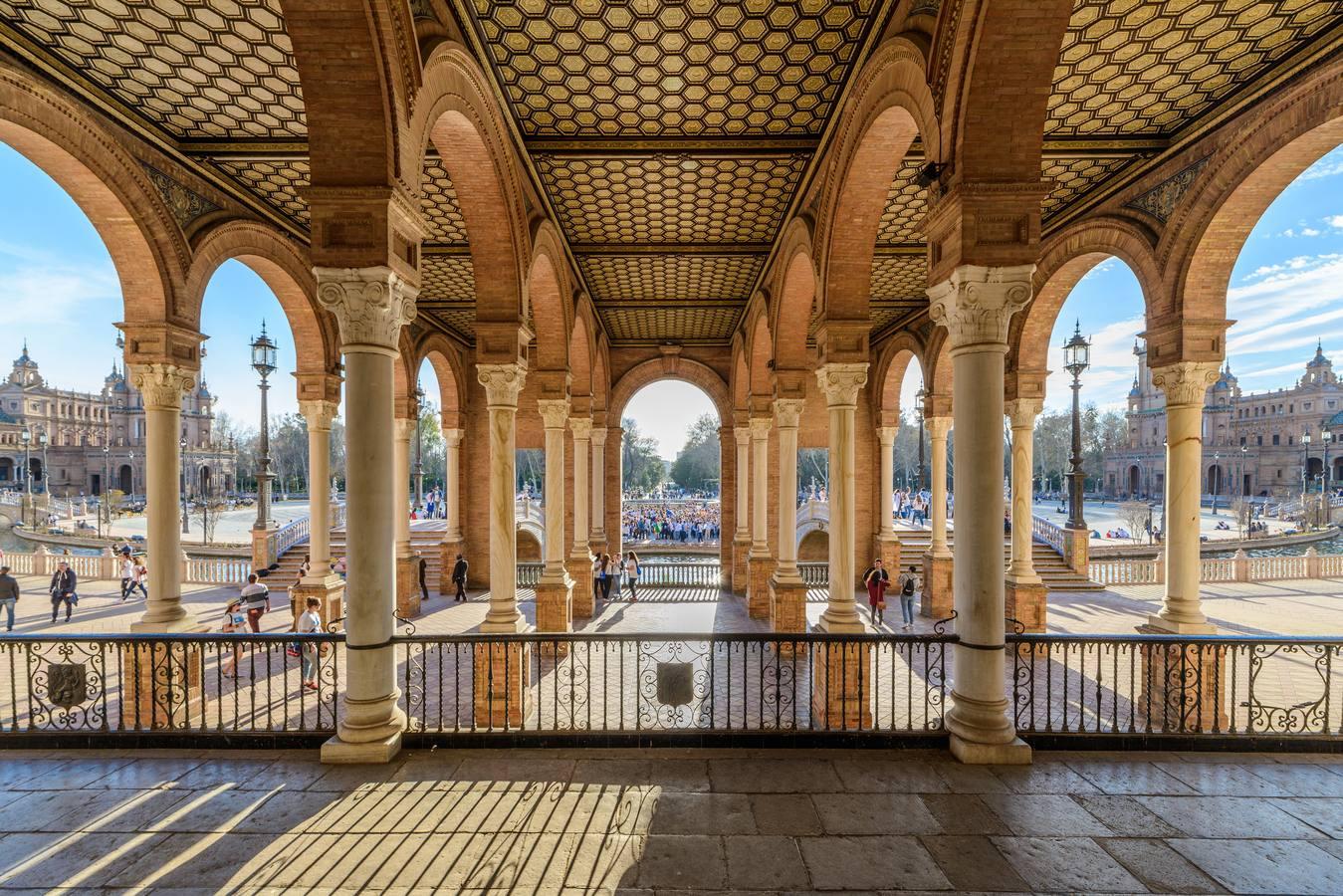 The Plaza de España, designed by Aníbal González, was a principal building built on the Maria Luisa Park’s edge to showcase Spain’s industry and technology exhibits. González combined a mix of 1920s Art Deco and Spanish Renaissance Revival, Spanish Baroque Revival and Neo-Mudéjar styles. The Plaza de España complex is a huge half-circle with buildings continually running around the edge accessible over the moat by numerous bridges representing the four ancient kingdoms of Spain. In the centre is the Vicente Traver fountain. By the walls of the Plaza are many tiled alcoves, each representing a different province of Spain. Each alcove is flanked by a pair of covered bookshelves, said to be used by visitors in the manner of “Little Free Library”. Each bookshelf often contains information about their province, yet you can often find regular books as well for some people have taken to donating their favorite book to these shelves.